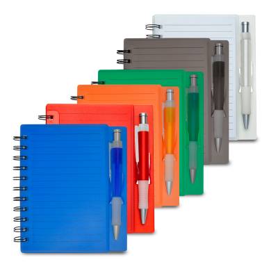 Bloco de anotações produzido em PVC translúcido, possui espiral preto, folhas pautadas e caneta plástica esferográfica com carga azul, perfeito para fazer suas anotações diárias com muita praticidade.
