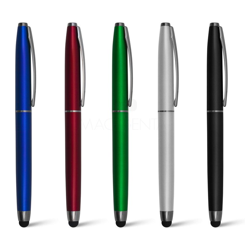 Caneta de plástico esferográfica com tampa e ponteira touch. Indicável agregar estojo de veludo. Cores disponíveis : preta, prata, azul, verde, grafite e vermelha