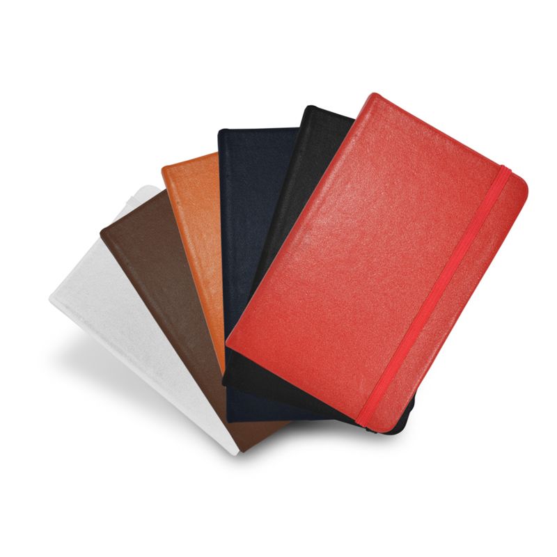 Bloco de Anotação com capa dura produzido em couro sintetico, possui elástico para fechamento, folhas pautadas, cantos arredondados, fita marcação de páginas e aproximadamente 80 folhas pautadas.