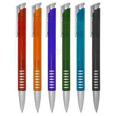Brindes Caneta de plástico personalizada com corpo transparente e colorido e detalhe em prata. Consultar as cores. Gravação silk