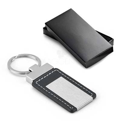 Chaveiro de metal e couro sintético para brindes personalizados. Acondicionado em embalagem preta.