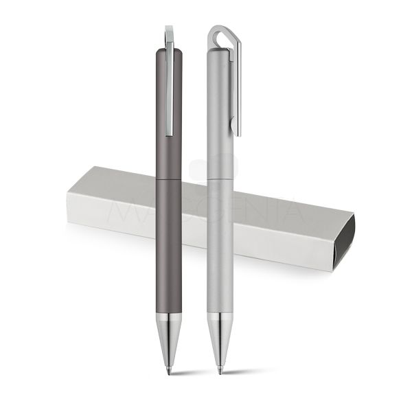 Caneta esferográfica para dar de brinde. Possui mecanismo twist, clipe com mola, em ferro com cromagem brilhante. Ponteira em cobre com revestimento mate. Corpo laqueado com revestimento fosco e acabamento interior platinado. Recarga tipo jumbo em metal G2. Tinta Dokumental azul.
