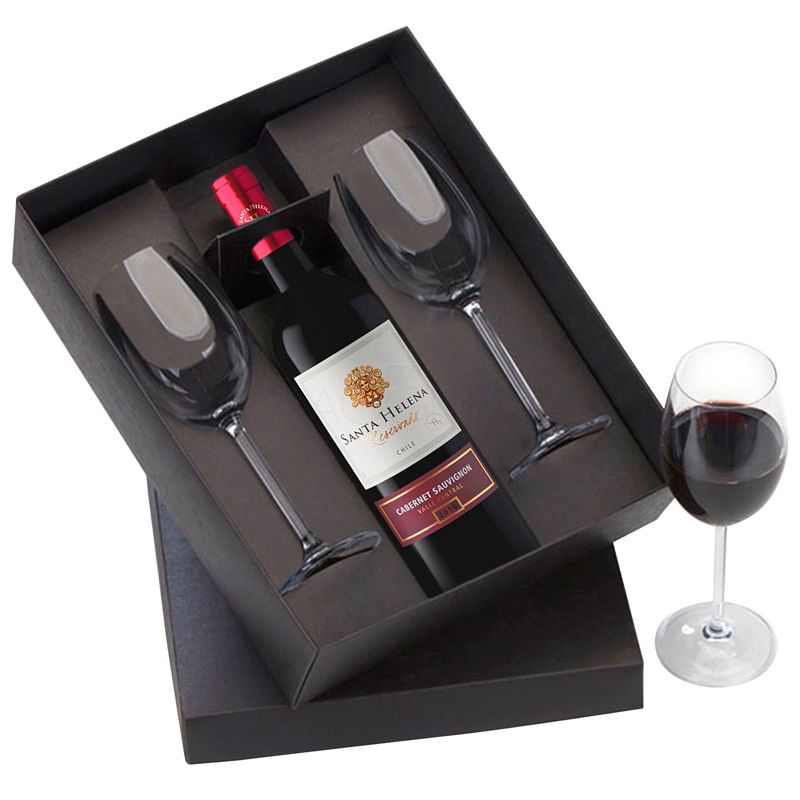 Kit vinho para brindes personalizados. Acompanha 1 garrafa de vinho de 750ml e 2 taças de 350ml.