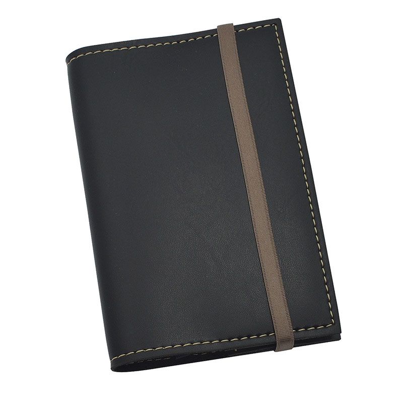 Bloco de anotações produzido em couro sintético, possui elástico de fechamento e aproximadamente 80 folhas lisas sem pautas.