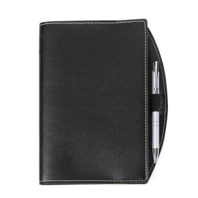 Bloco de Anotações produzido em couro sintético e bloco interno com aproximadamente 80 folhas sem pautas.