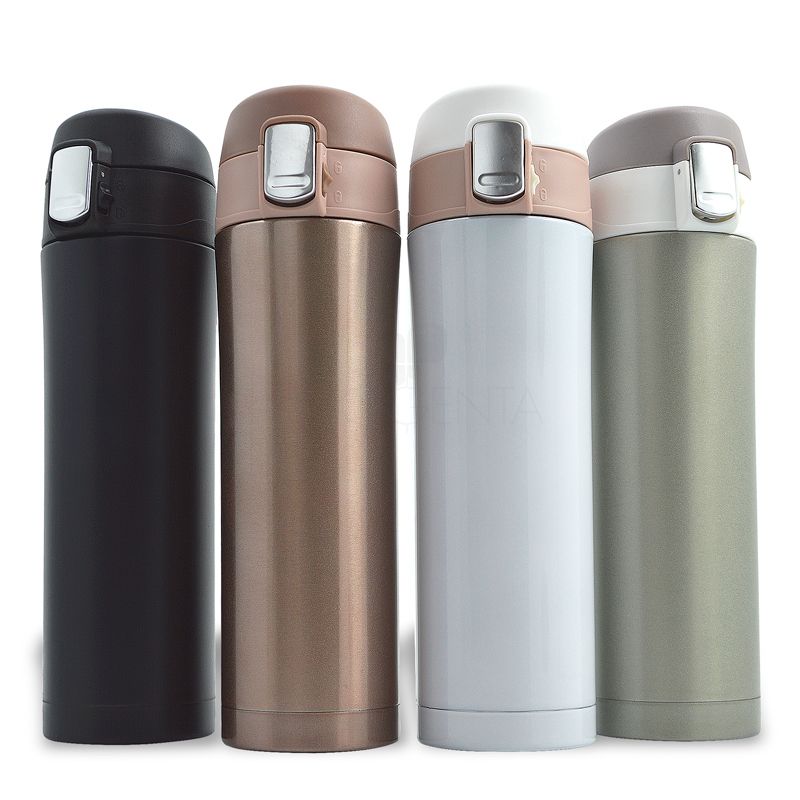 Possui abertura automática acionada por botão frontal após destravamento do botão de segurança lateral, tampa rosqueável com silicone interna atóxica. Capacidade 500ml.