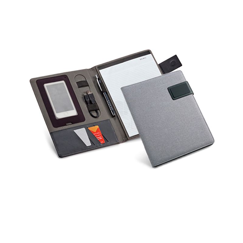 Linho sintético e couro sintético. Fecho magnético. Bloco: 20 folhas pautadas. Chapa metálica com acabamento emborrachado. Esferográfica não inclusa.
