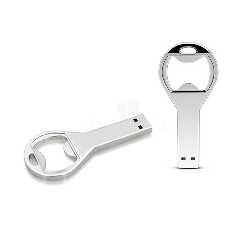 Em metal no formato abridor de garrafa.