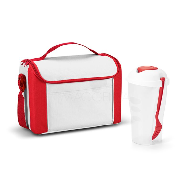 Bolsa Térmica confeccionada em Poliéster 600D, acompanha 1 copo para Salada de 800ml,1 garfo e 1 mini pote para molho, possui abertura em zíper superior, pala com 2 cursores e revestimento térmico interno para conservar bebidas e alimentos por mais tempo.