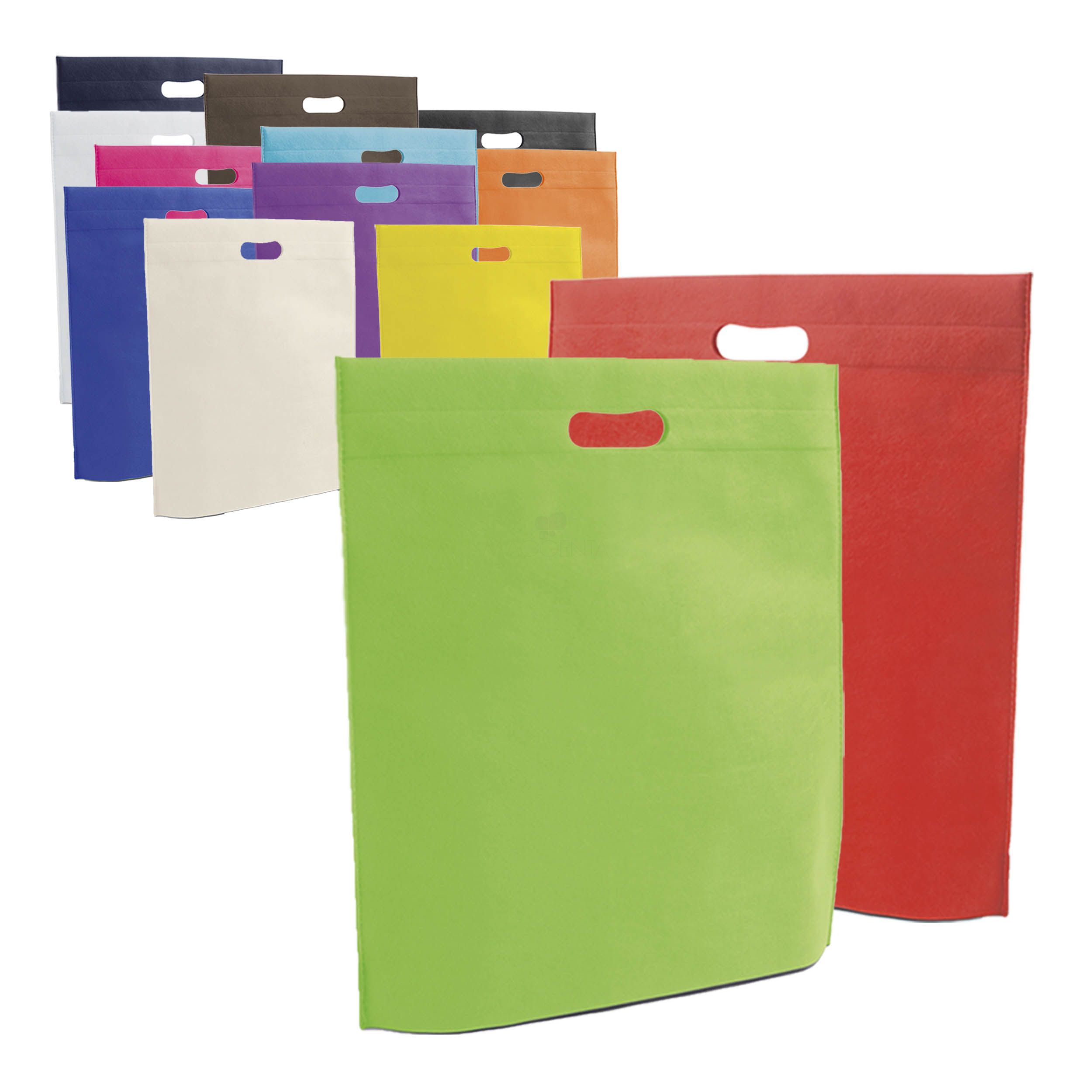 Produzida em Non-woven 80 g/m², tecido ecológico 100% reutilizável, fabricado em parte com materiais reciclados e seu acabamento é de fechamento termo-selado.