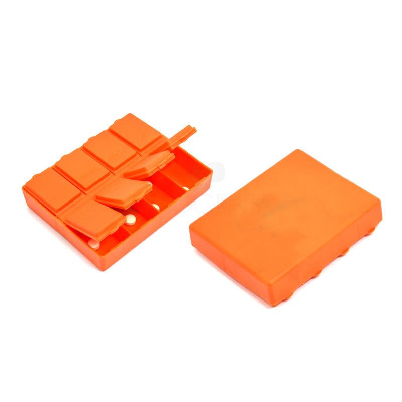 Porta comprimidos no formato retangular com 8 compartimentos para colocar comprimidos ou cápsulas. Possui tampa articulada com dias da semana para facilitar a organização.