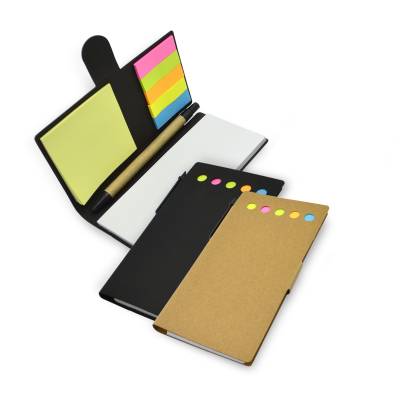 Bloco de anotações com capa em papel kraft com 50 folhas pautadas, 20 autocolantes amarelo para recados, 20 autocolantes coloridos e 1 caneta esferográfica.