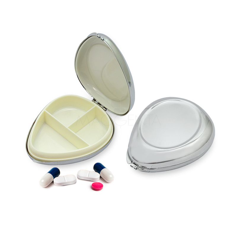 Porta comprimido de metal com tampa personalizada e 3 compartimentos para colocar comprimidos ou cápsulas. Ideal para brindes promocionais e eventos corporativos.