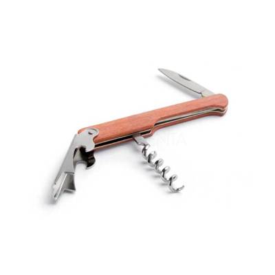 Saca-rolha personalizado produzido com detalhes em madeira, possui abridor de garrafas, mini canivete e saca rolha em metal.