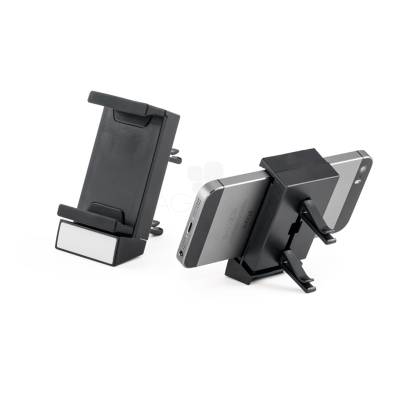 Suporte veicular personalizado produzido em ABS, possui ajuste retrátil para se adaptar a cada modelo de smartphone e engate traseiro para fixação na saída de ar frontal do painel interno do carro.