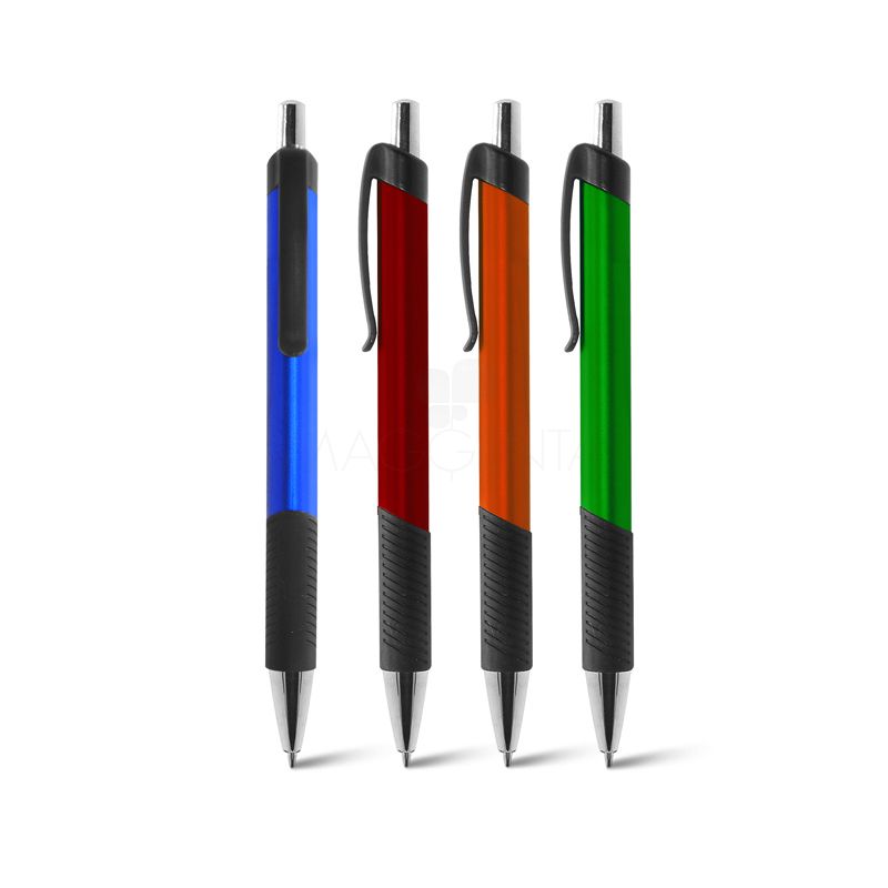 Caneta plástica personalizada com design diferenciado na área inferior que proporciona um escrita mais firme e confortável. Possui esferográfica azul e acionamento por click.
