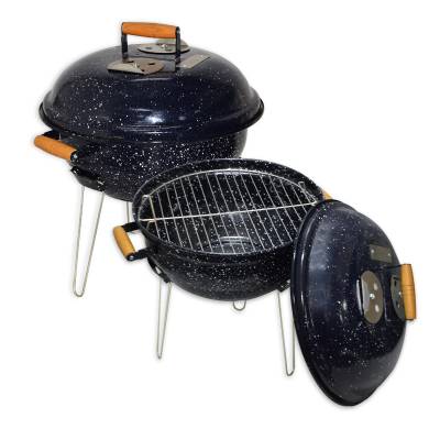 Churrasqueira à Bafo com pé baixo produzida em aço esmaltado, possui 3 tampas de inox de respiro, alças em madeira, uma grelha inferior para apoio do carvão, uma grelha superior estanhada e 3 pés de arame zincado.