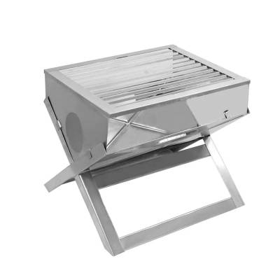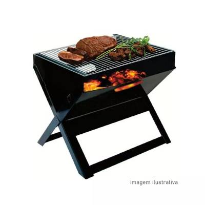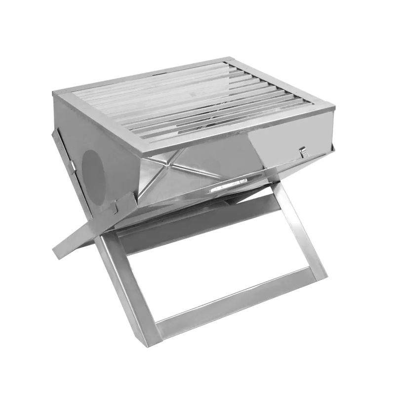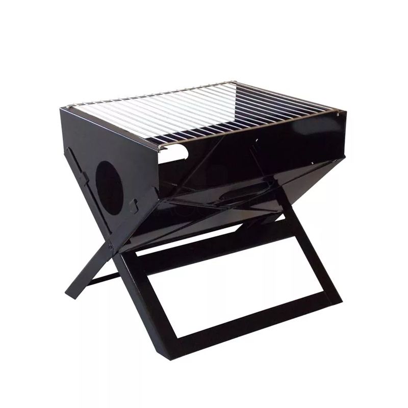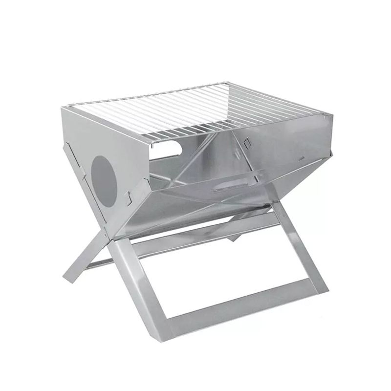 Churrasqueira dobrável produzida em material inox, possui grelha superior, lateral aberta para reposição de carvão e fechamento em formato de X.