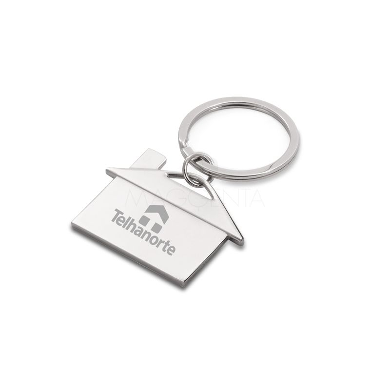 Chaveiro de metal personalizado no formado de casa, Possui acabamento brilhoso, detalhe em relevo e argola para adicionar suas chaves e facilitar seu dia. Acompanha embalagem em caixinha preta. Ideal para divulgar sua empresa em eventos corporativos, brindes personalizados e campanhas promocionais.