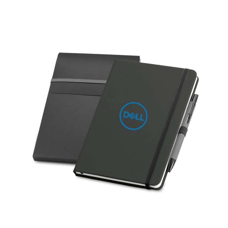 Bloco de anotações personalizado produzido em couro sintético com capa dura, possui 80 folhas não pautadas na cor branca, embalagem de pp em formato de caixa e caneta de metal esferográfica com acionamento por clik. Ideal para divulgar sua empresa em eventos corporativos, brindes personalizados e campanhas promocionais. Caneta: ø10 x 137 mm