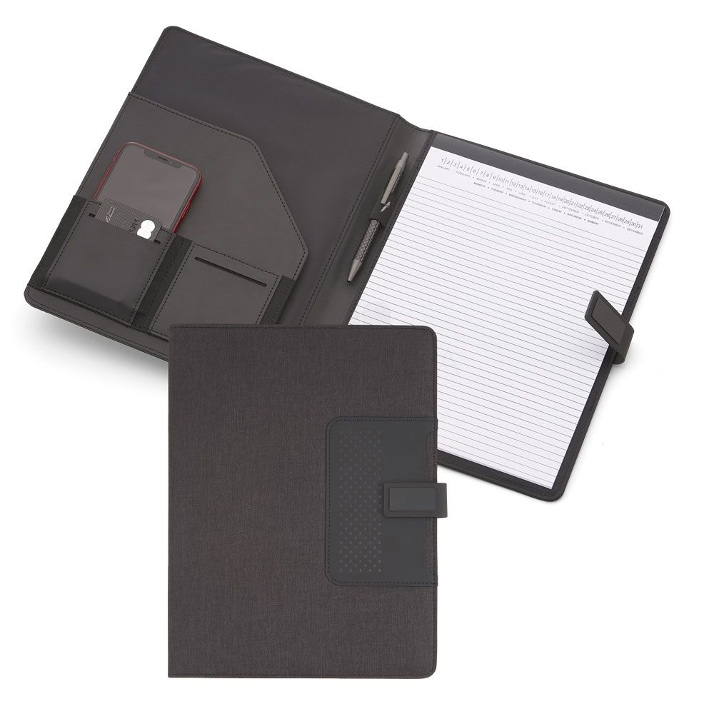 Pasta executiva personalizado com acabamento almofadado, possui caderno com 20 folhas brancas no formato A4 com pautas, bolso frontal na capa 8 x 12 cm, compartimento interno para documentos, cartões, smartphone e documentos pessoais, porta caneta central em elástico e fechamento magnético com placa de metal com acabamento emborrachado. Ideal para divulgar sua empresa em eventos corporativos, brindes personalizados e campanhas promocionais. Caneta não acompanha o produto.