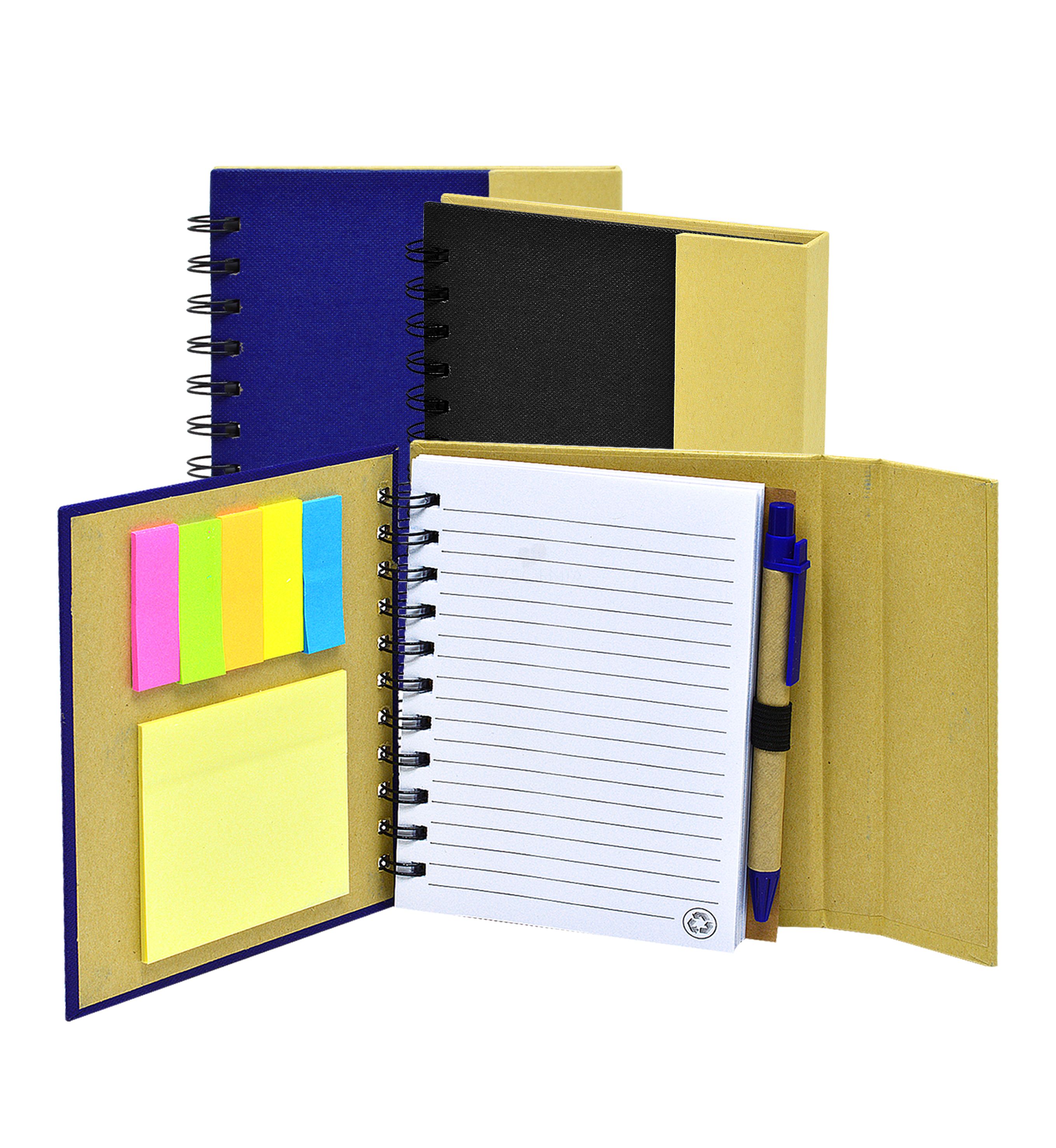 Bloco de anotações produzido em papel kraft com detalhe texturado na capa, possui wire-o de metal, capa dura com fechamento por ímã, folhas pautadas na cor branca, 20 autocolantes amarelo para recados, 5 cores de autocolante com 20 folhas cada e 1 caneta ecológica com acionamento da escrita por clik na cor azul.