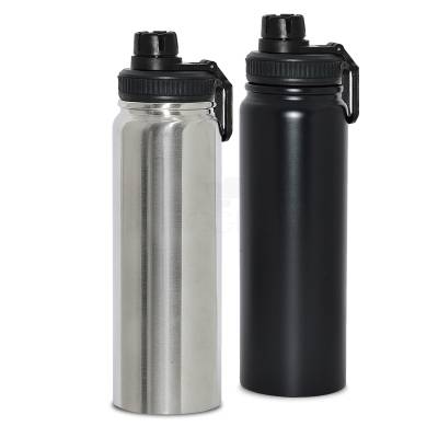 Squeeze de metal personalizado com acabamento em inox escovado na cor prata, possui alça de mão acoplada na tampa, tampa principal rosqueável, tampa protetora para o bico e capacidade para 900ml. Ideal para divulgar sua empresa em eventos corporativos, brindes promocionais e eventos.