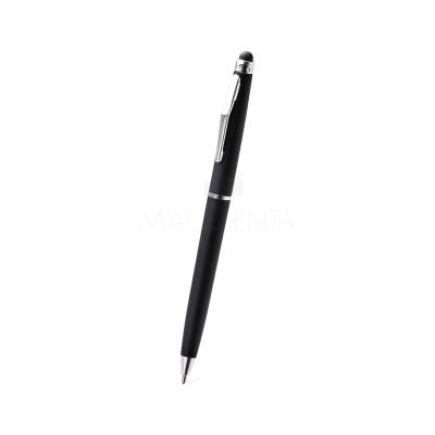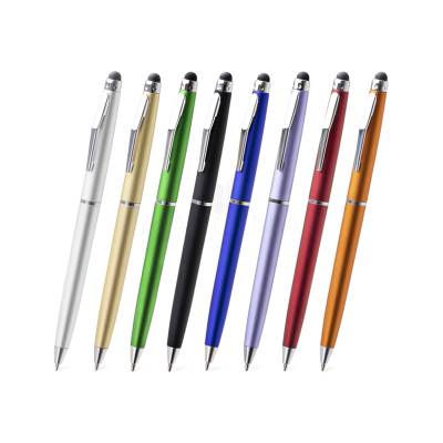 Caneta de plástico personalizada com ponteira touch, clip e anel cromado e esferográfica cor azul com acionamento por giro. Imagem ilustrativa. Ideal para brindes promocionais e eventos corporativos. .
