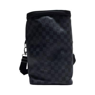 Porta vinho personalizado produzido em couro sintético com compartimentos para 4 garrafas e alça transversal reguladora.