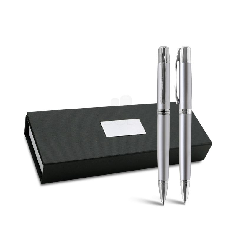 Conjunto caneta e lapiseira personalizadas produzidas em metal brilhante com detalhes circulares em relevo e acionamento por giro. Distribuídas em um elegante estojo com placa para gravação e revestimento interno de espuma. Ideal para presentear aquele cliente especial, distribuir em feiras e eventos corporativos.