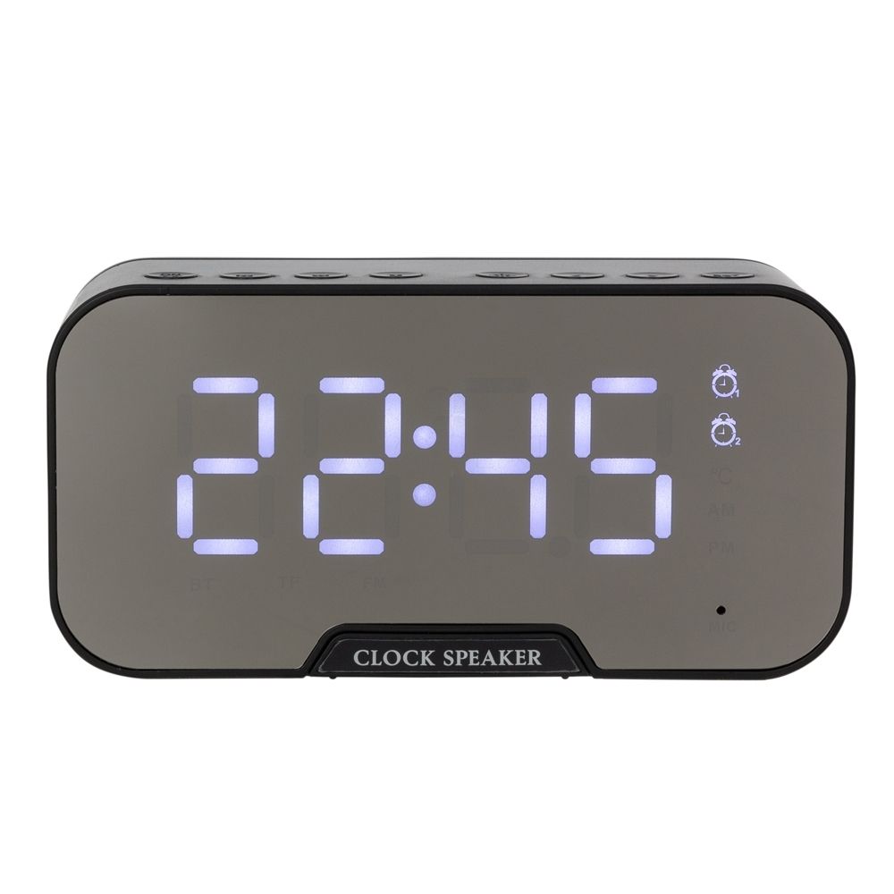 Caixa de som com relógio personalizada produzida em plástico com detalhes de borracha. Possui display de LED, base antiderrapante, botões de controle na parte superior para alternar o volume, as faixas, os modos, play e pause, liga e desliga, os botões < e > ao serem pressionador durante o modo de configuração, irão ajustar o relógio, despertador e toque do alarme e o botão SET ao ser pressionado irá alterar entre as opções . A caixa de som executa nos modos bluetooth, rádio FM, cartão TF-microSD (até 16GB) e entrada auxiliar P2, Suporte para celular, Bluetooth V 5.0; Frequência de resposta 80Hz-20KHz; Frequência de rádio 87.5MHz-108MHz; Bateria de lithium 3.7V com 1400mAh; Distância de alcance 10 metros; Voltagem DC 5V; Falante 4?3W; SNR ?65db e distorção <0,5% . Acompanha cabo USB e manual em inglês. Ideal para brindes, distribuição em eventos e campanhas promocionais.