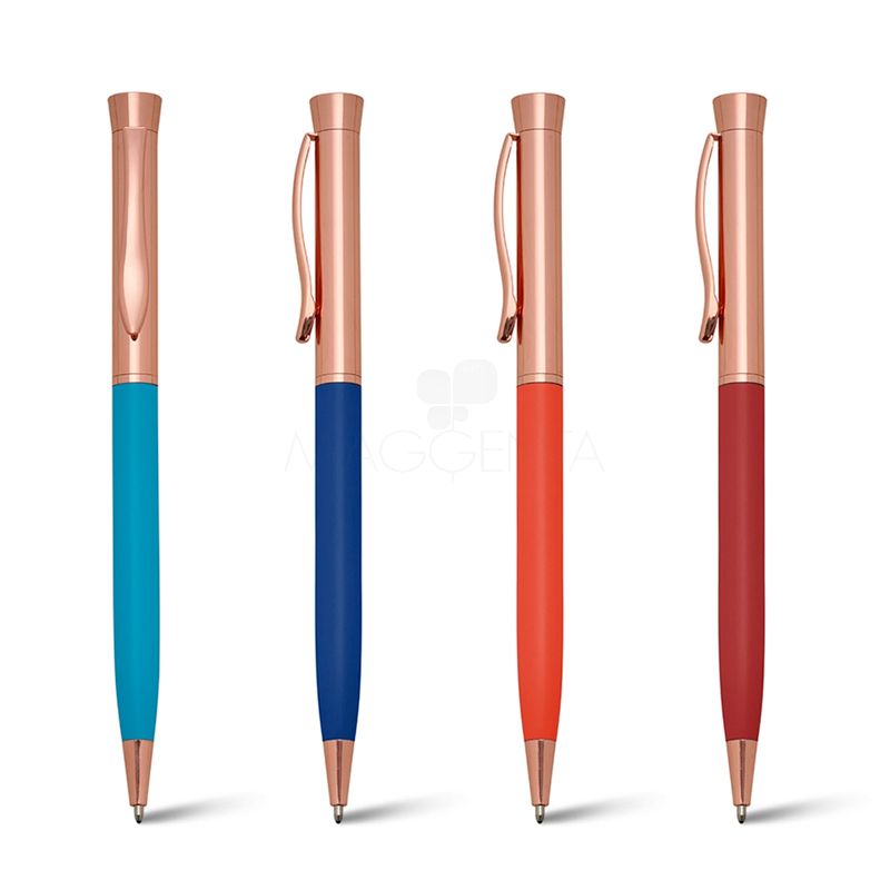 Caneta de metal personalizada com detalhes em metal dourado rosê, possui acionamento por giro, clip diferenciado de metal e esferográfica na cor azul. Ideal para brindes promocionais e eventos corporativos.