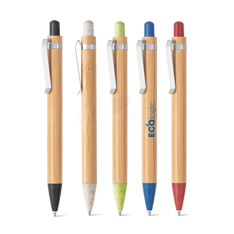 Caneta ecológica personalizada produzida em bambu com clip de metal e elementos em fibra de trigo e ABS, possui esferográfica azul e acionamento da escrita por click. Produto inovador visando campanhas que defendem um mundo mais sustentável. Ideal para divulgar sua empresa em eventos corporativos, brindes personalizados e campanhas promocionais.