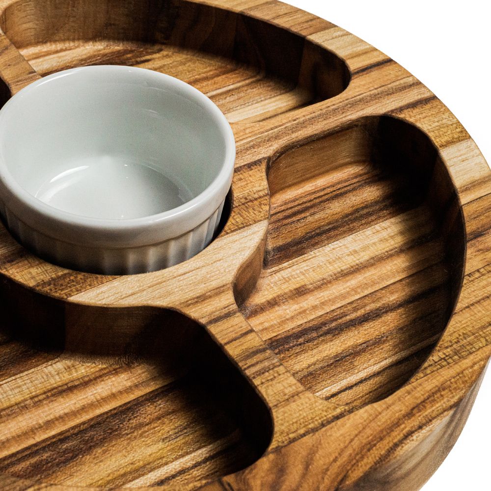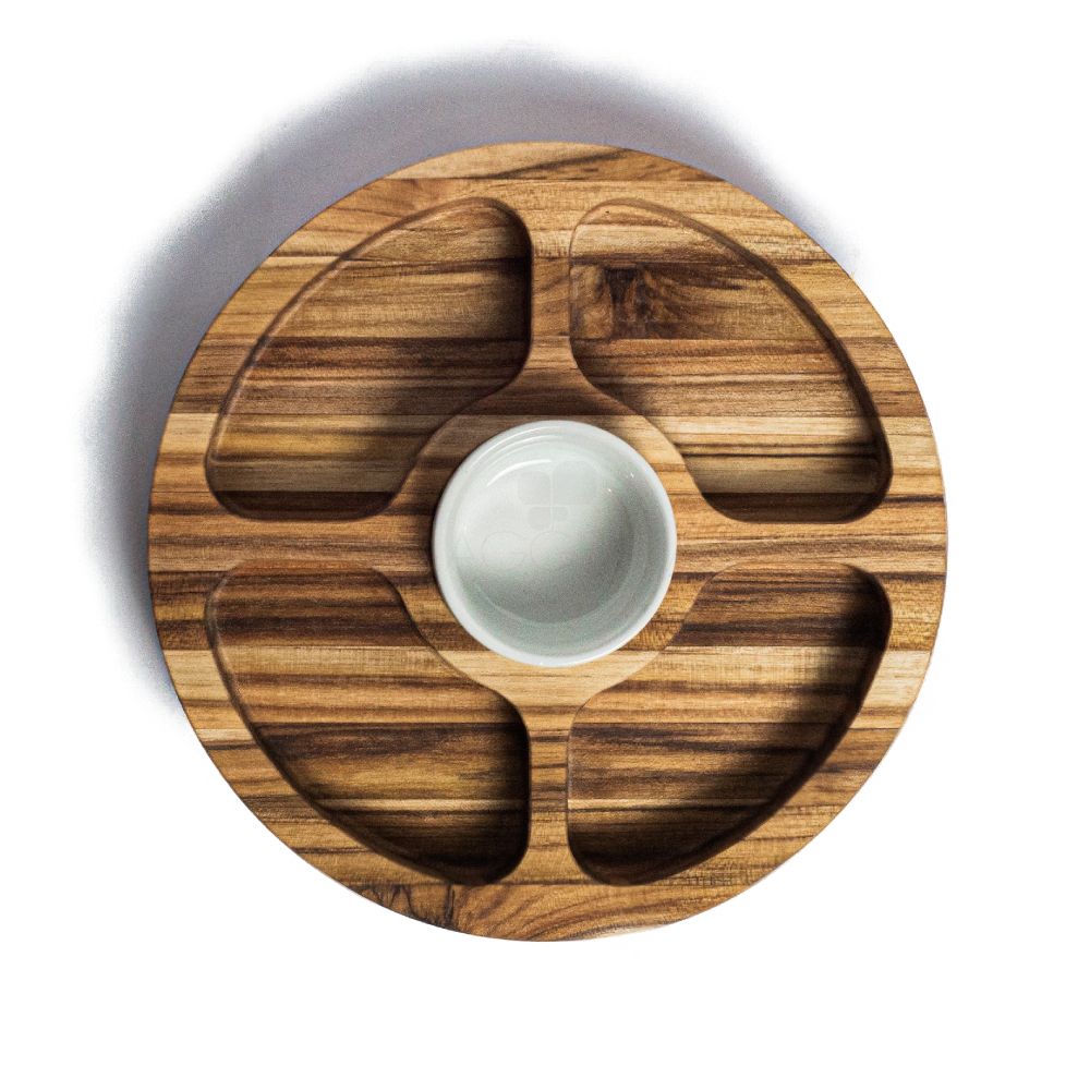 Petisqueira de Madeira com cinco compartimentos e um ramekin. Design moderno e elegante perfeito para trabalhos culinários de alto padrão. Ideal para brindes em campanhas promocionais, eventos corporativos e feiras gastronômicas.