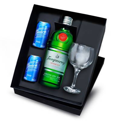 Kit personalizado com 1 Garrafa GIN TANQUERAY TEN de 750ml, 2 latas de Água tônica de 350ml cada, 1 taças GIN de vidro 600ml, boca mais aberta e bojo largo e embalagem em papel paraná 80gr revestido de papel color plus. Visual elegante e conteporâneo, É o presente ideal para presentear colaborador, fornecedores e clientes em momentos memoráveis.