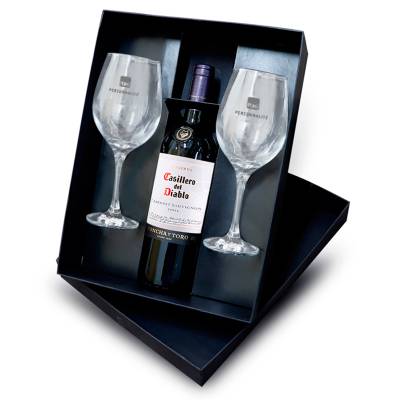 Kit Vinho personalizado com 1 Garrafa de vinho Casillero del Diablo de 750ml, 2 taças de Vidro de 490ml com bojo grande, haste longa, boca fechada para melhor concentração do aroma e embalagem em papel paraná 80gr revestido de papel color plus. Visual elegante e conteporâneo, É o presente ideal para presentear colaborador, fornecedores e clientes em momentos memoráveis.