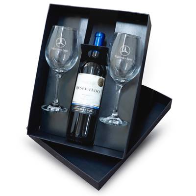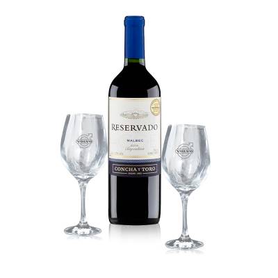 Kit Vinho personalizado com 1 Garrafa de vinho RESERVADO MALBEC de 750ml, 2 taças de Vidro de 490ml com bojo grande, haste longa, boca fechada para melhor concentração do aroma e embalagem em papel paraná 80gr revestido de papel color plus. Visual elegante e contemporâneo, É o presente ideal para presentear colaborador, fornecedores e clientes em momentos memoráveis.