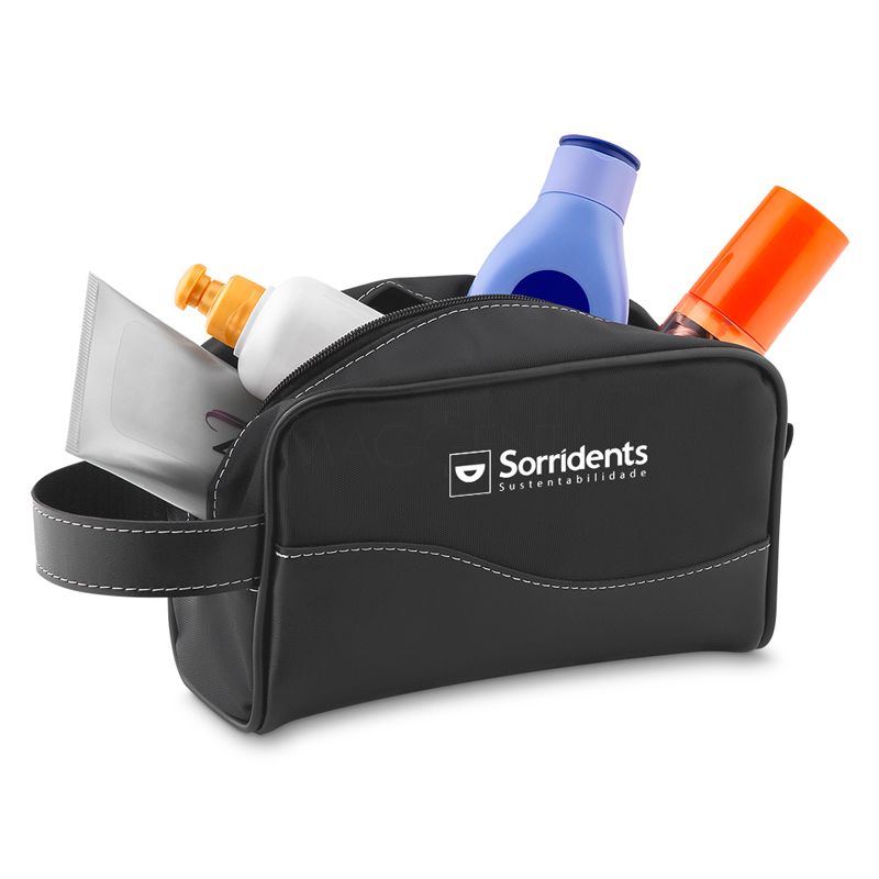 Necessaire personalizada em tecido sintético e nylon 70 preto. Possui forro interno em nylon, alça de mão lateral para transporte, lapela lateral, parte inferior com acabamento personalizado em material sintético e fechamento por zíper. Imagem ilustrativa.