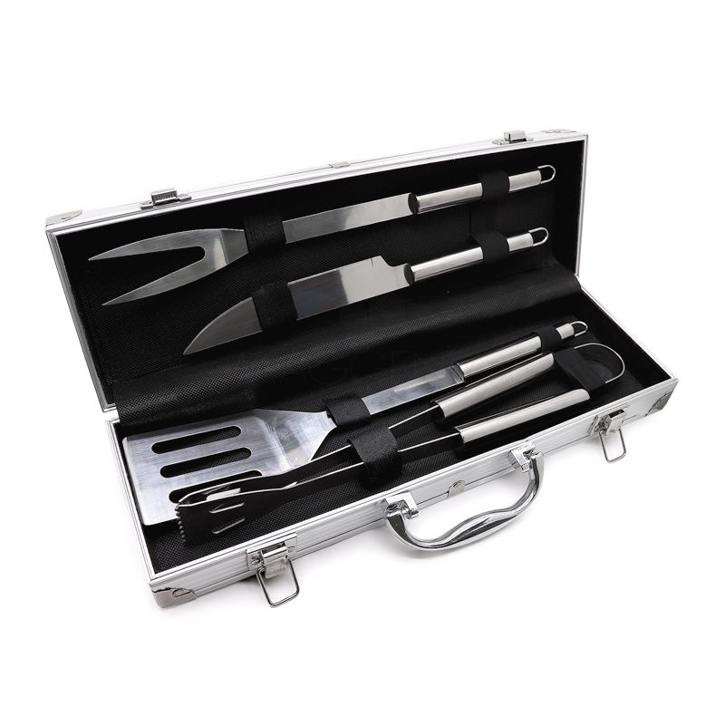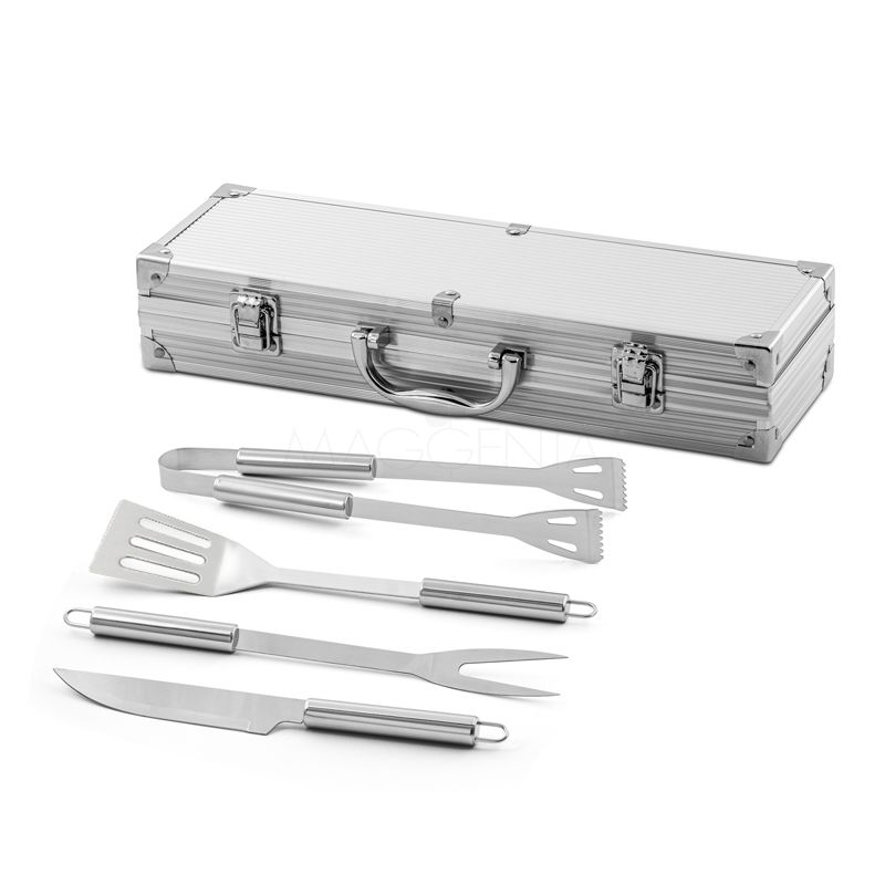 Kit churrasco 4 peças em maleta de alumínio com travas de segurança. Possui 1 espátula, 1 pegador, 1 garfo e 1 faca em inox. Parte interna da maleta com revestimento em Tnt e suportes de velcro para fixação das peças.