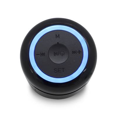Caixa de som bluetooth com relógio despertador, produzida em plástico e com borrachas antiderrapantes na área inferior, a caixa de som tem bateria de longa duração, display de LED na área frontal, e anel de led brilhante na parte superior. A caixa de som executa nos modos bluetooth, rádio FM, cartão TF-microSD e entrada auxiliar P2. Acompanha cabo USB e manual em inglês e chinês. Imagem ilustrativa.