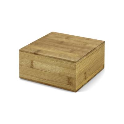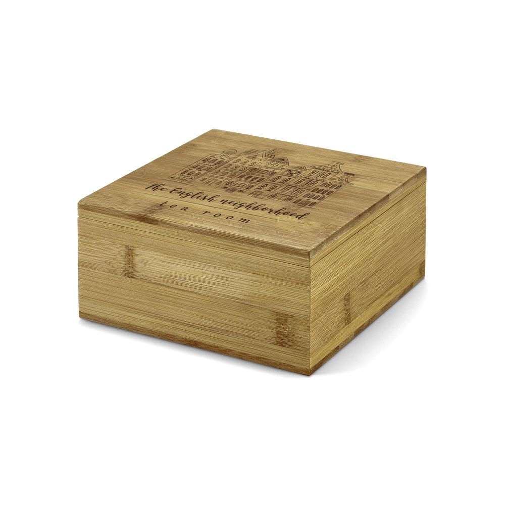 Caixa de bambu personalizada com 4 compartimentos para saches de chá, Possui tampa personalizada com fecho em ímã.
