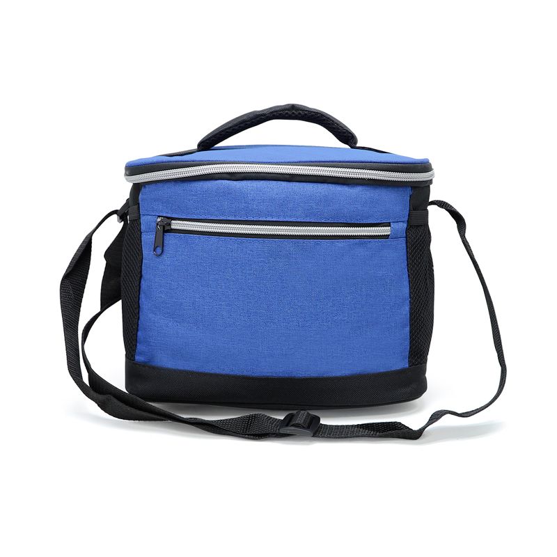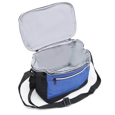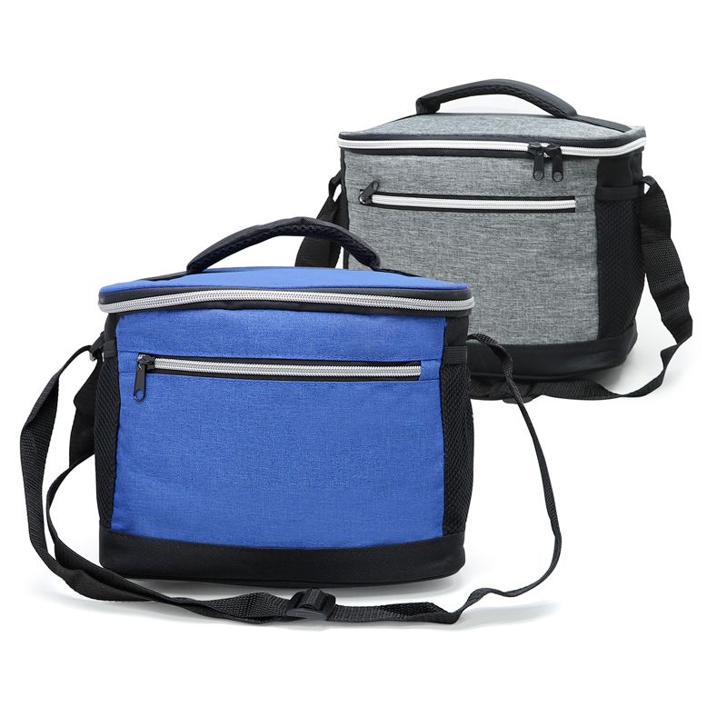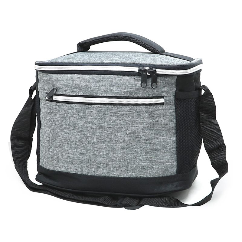 Bolsa térmica personalizada com capacidade para 10 litros. Possui bolso frontal e principal com zíper, bolsos laterais em tela em nylon, cursores de metal, alça transversal regulável para ombro, alça de mão almofadada e compartimento interno com revestimento térmico. Ideal para brindes promocionais e eventos corporativos. Imagem ilustrativa.