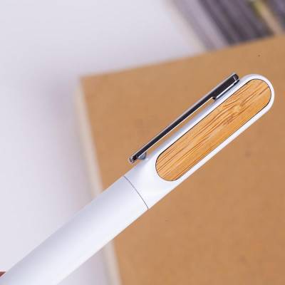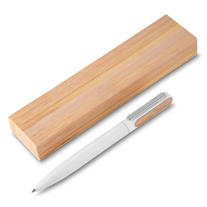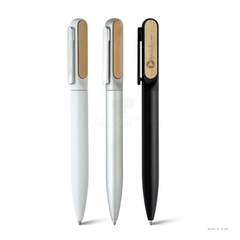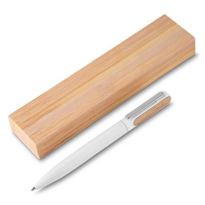Caneta de metal personalizada com acabamento diferenciado, possui clip de metal, acabamento com detalhe em bambu e esferográfica azul com acionamento por giro. Ideal para brindes promocionais e eventos corporativos. Imagem ilustrativa.