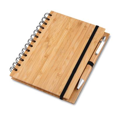 Bloco de anotações personalizado produzido em bambu com capa dura. Possui elástico para fechamento, wire-o de metal, caneta esferográfica em bambu com acionamento por clik e 70 folhas pautadas de papel reciclado. Ideal para divulgar sua empresa em eventos corporativos, brindes personalizados e campanhas promocionais.