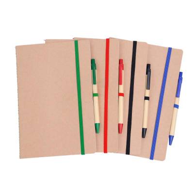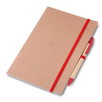 Bloco de anotações personalizado produzido em capa de papel kraft com elástico para fechamento da capa. Possui suporte lateral para caneta, miolo com 30 folhas pautadas e 1 caneta esferográfica com corpo em papel reciclado e clip plástico. Imagem ilustrativa.