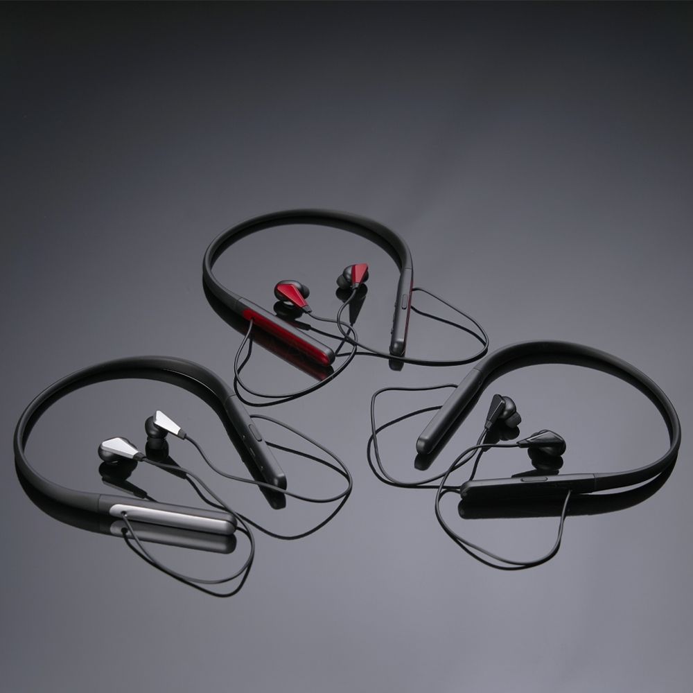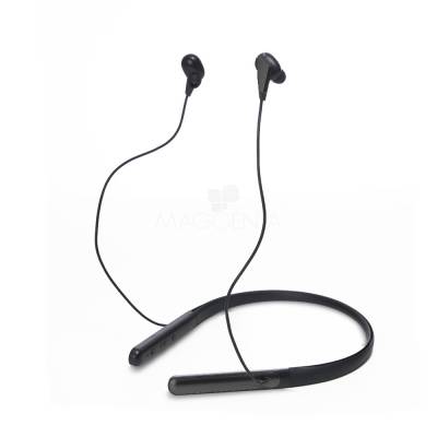 Fone de ouvido bluetooth com haste para pescoço. Possui microfone para atendimento de chamadas telefônicas, botões liga/desliga, função volume + –, e haste com entrada para carregamento micro USB, acompanha USB paca carregamento. Ideal para brindes promocionais e eventos corporativos. Imagem ilustrativa.