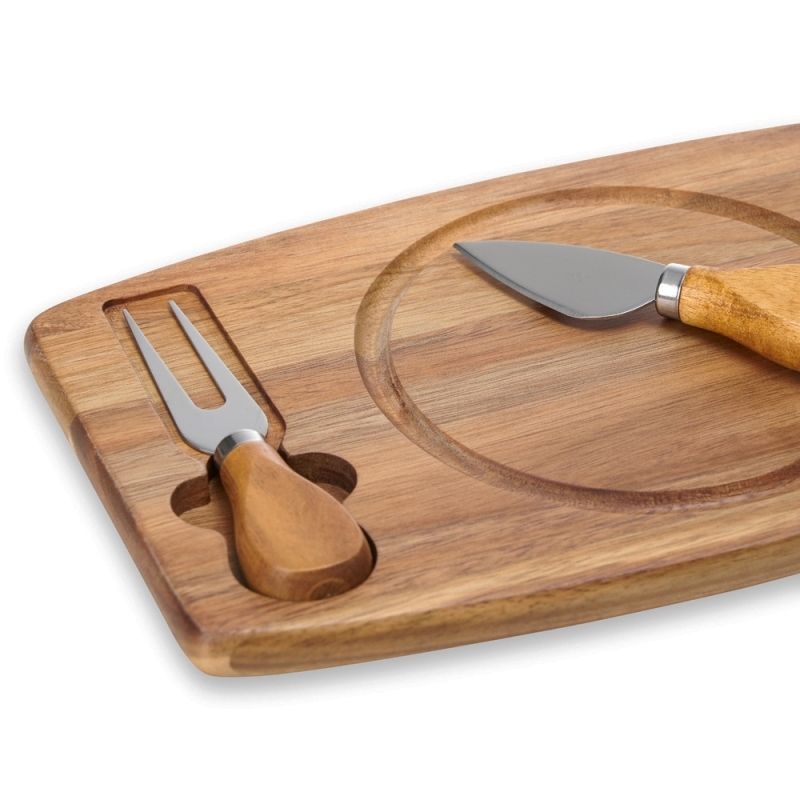 Kit queijo 3 peças, contém: tábua de madeira com canaleta, faca com ponta, e garfo. Tábua com imã para encaixe e fixação dos utensílios. Ideal para brindes promocionais e eventos corporativos. Imagem ilustrativa.