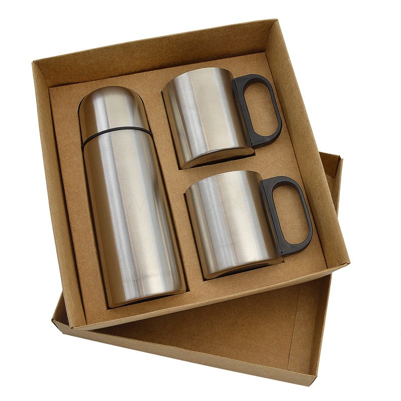 Conjunto de Garrafa e Caneca em metal Inox com acabamento aço escovado. Acompanha 1 Garrafa 350ML e 2 Canecas térmicas com capacidade para 180ML acondicionados em uma embalagem de papel kraft 400gr.