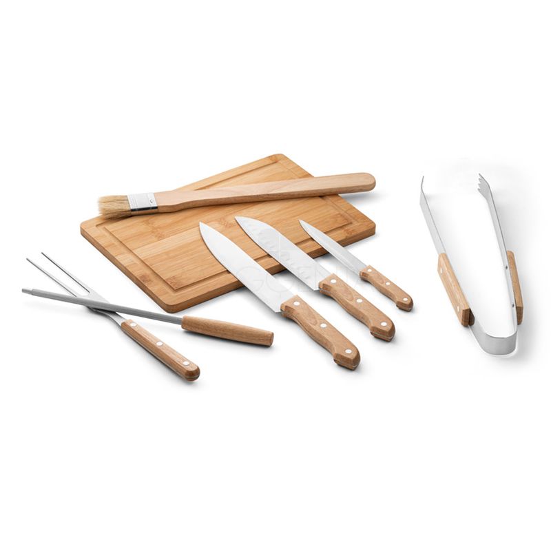 Kit churrasco personalizado com em estojo em tecido sintético PU e 210D. Composto por 1 tábua em bambu e 7 utensílios em aço inox com cabo em madeira de seringueira: faca japonesa, faca chefe, garfo, pinça, faca pequena, afiador e pincel. Próprio para contato com alimento. Estojo: 250 x 370 x 45 mm | Tábua: 300 x 200 x 11,6 mm. Ideal para brindes promocionais e eventos corporativos. Imagem ilustrativa.