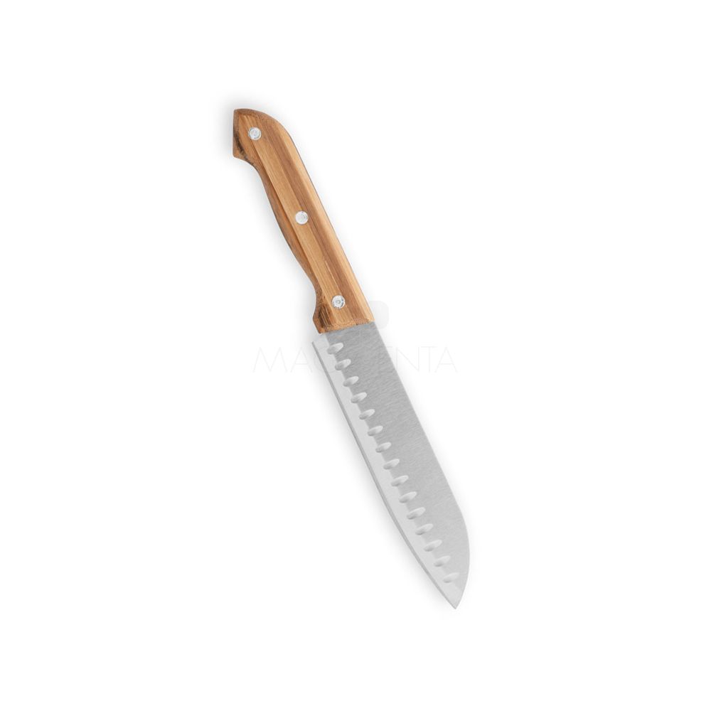 Kit churrasco personalizado com em estojo de bambu. Composto por 4 utensílios em aço inox e bambu: faca japonesa, faca chefe, faca boning e garfo. Próprio para cortes de alimento e carnes em geral. Ideal para brindes promocionais e eventos corporativos.